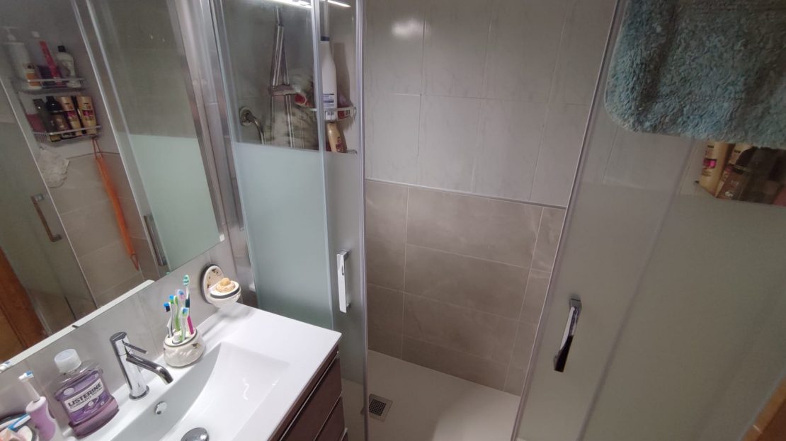 El interior presenta dos dormitorios dobles de generosas dimensiones, cada uno con modernos armarios empotrados. La cocina, totalmente equipada, cuenta con una barra de desayuno. El baño ha sido renovado recientemente, con nuevos azulejos y una ducha a ras de suelo.