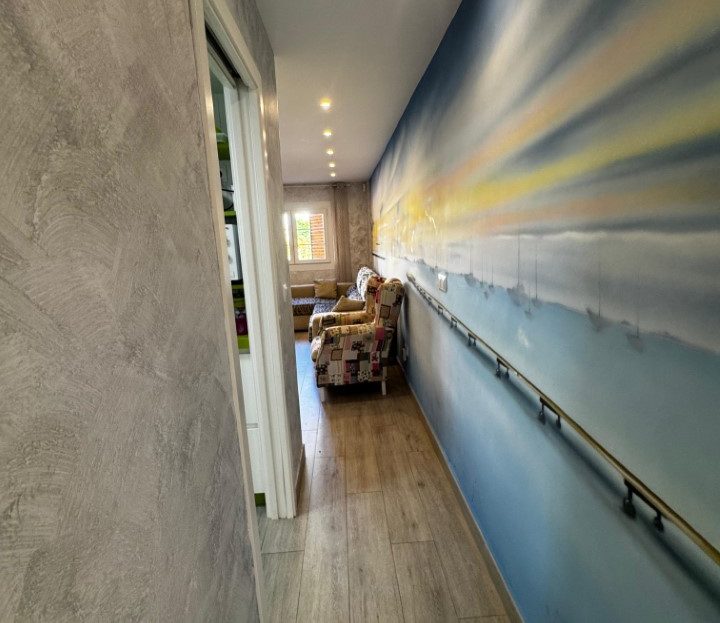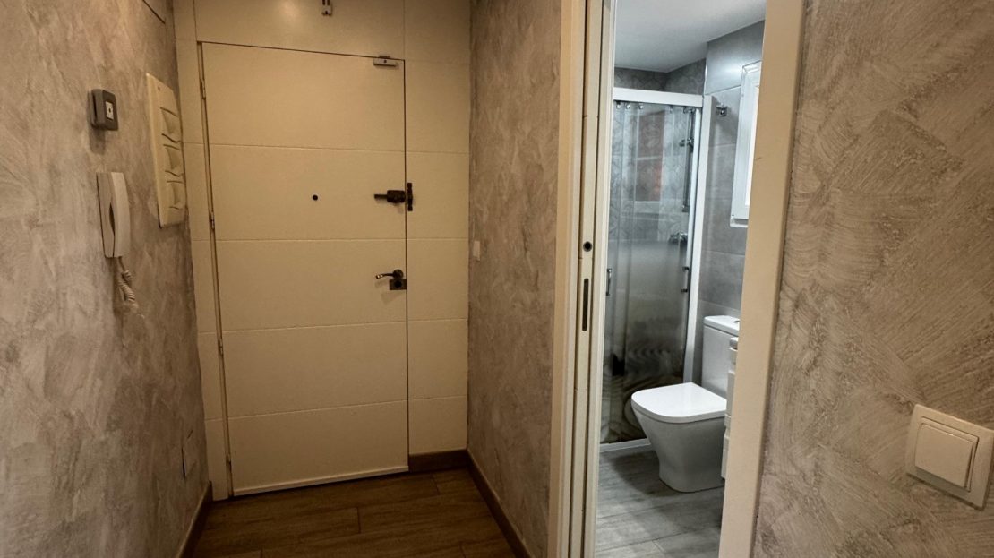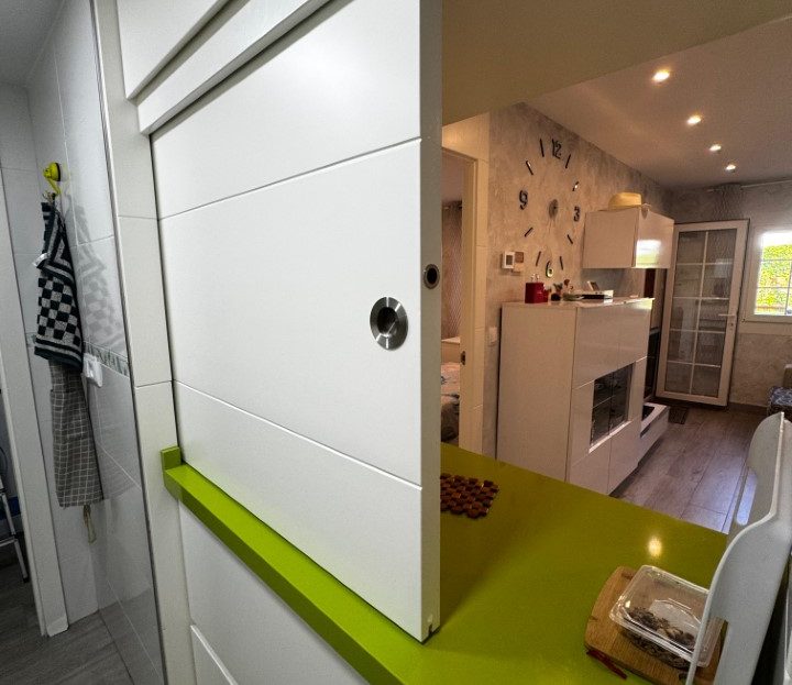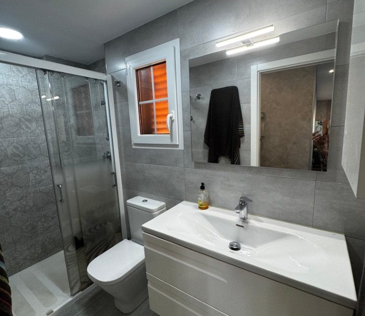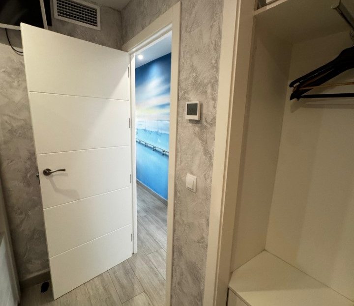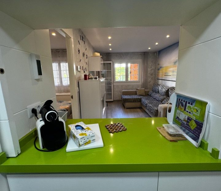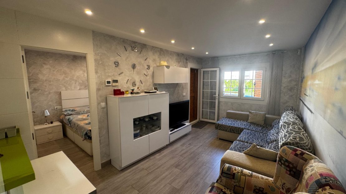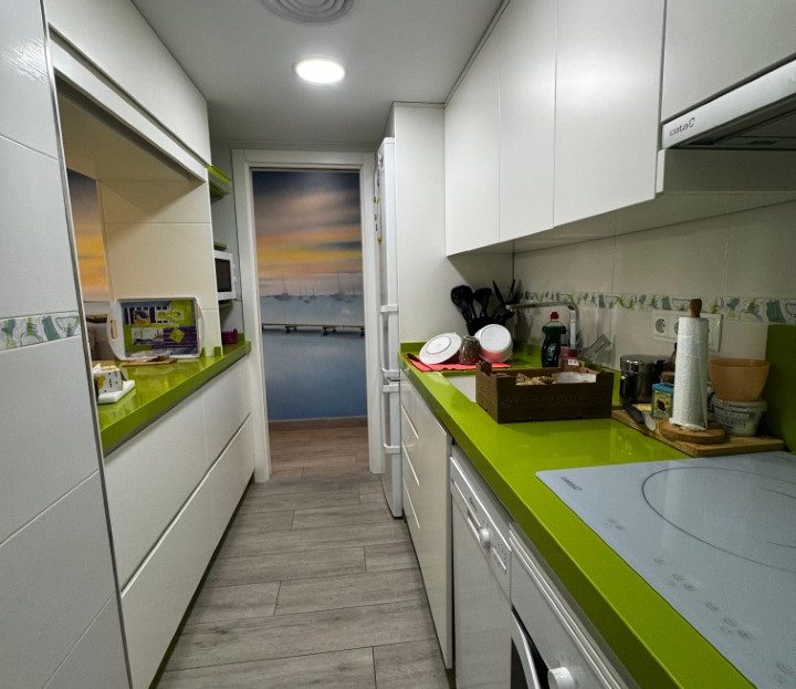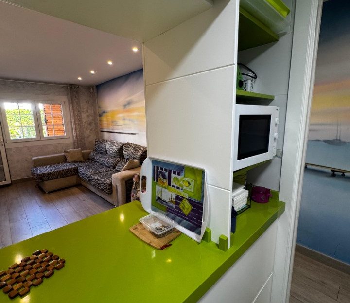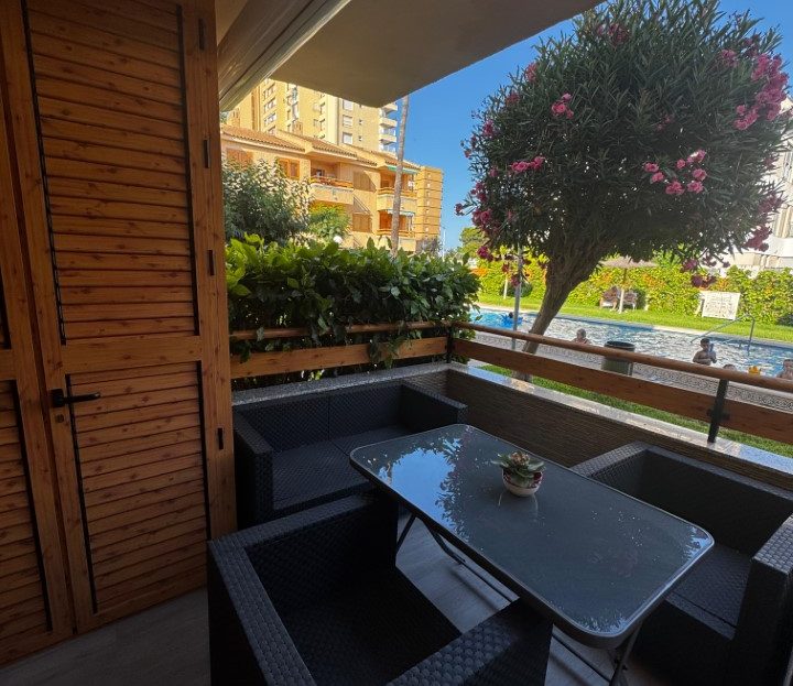 Apartamento en planta baja con terraza, totalmente reformado. Salón comedor con salida a la terraza, que da a la zona verde y con vistas a la piscina, 2 dormitorios con armarios empotrados, 1 baño completo con ventana, cocina americana con galería. Vivienda ubicada en residencial privado con zonas ajardinas y piscina muy cerca de la playa en Santiago de la Ribera a tan solo tres calles.