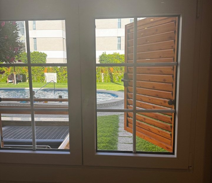 Urbanización privada con zonas ajardinadas y piscina comunitaria, cerca de la playa.