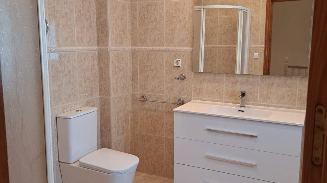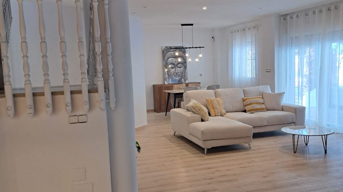 Propiedad, recientemente renovada, ofrece una vida de lujo con un diseño espacioso que abarca más de 145 metros cuadrados distribuidos en dos plantas. La casa cuenta con 5 dormitorios y 3 baños, proporcionando un amplio espacio incluso para una familia numerosa. Al entrar por la puerta principal, se accede a un espacioso vestíbulo que conecta con un gran salón. A la derecha, hay 3 dormitorios y 2 baños. El salón tiene acceso a una amplia cocina independiente, al lado de la cual se encuentra un gran almacén/lavadero. Desde el salón, se puede acceder directamente al jardín y a la zona de la piscina a través de puertas de cristal.